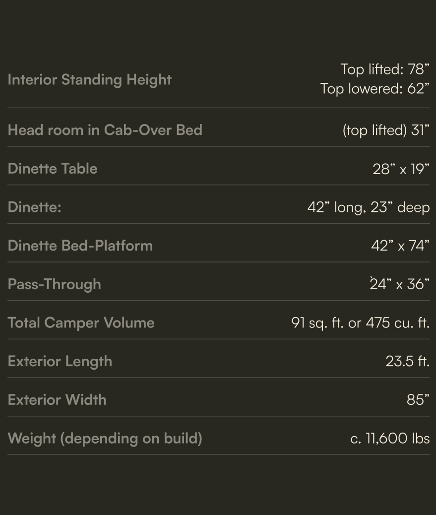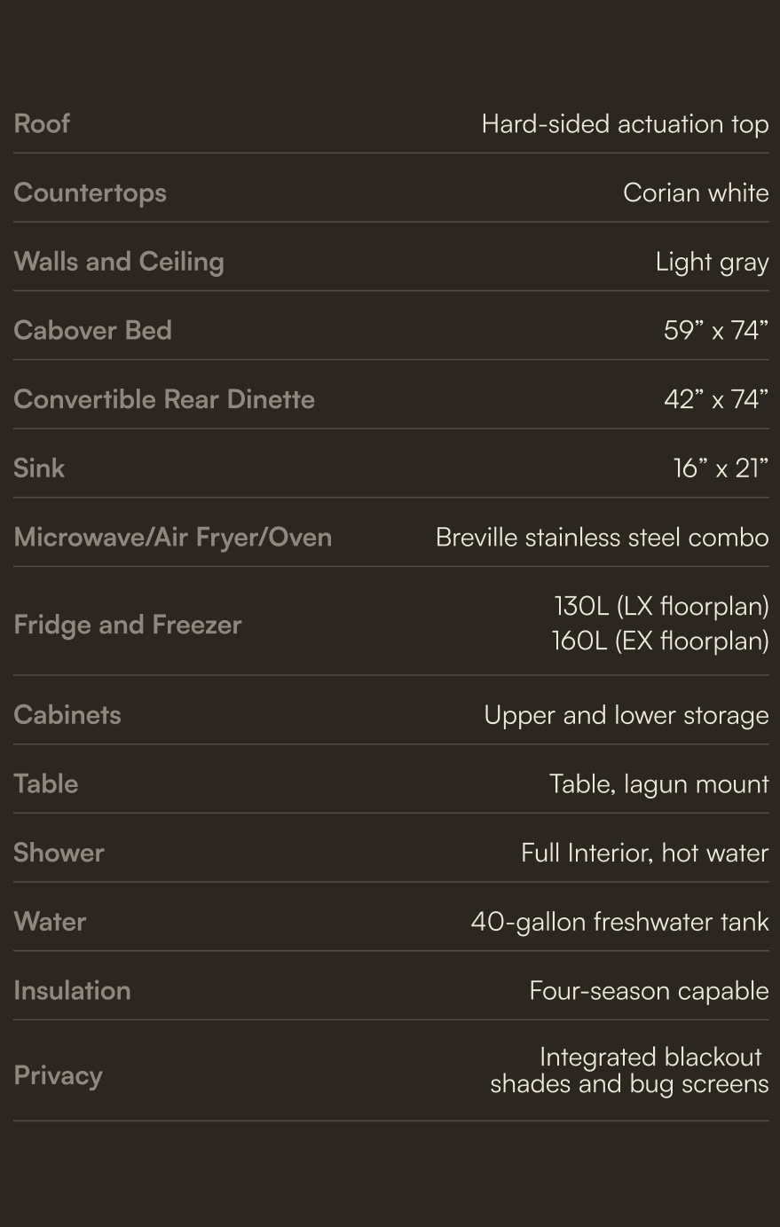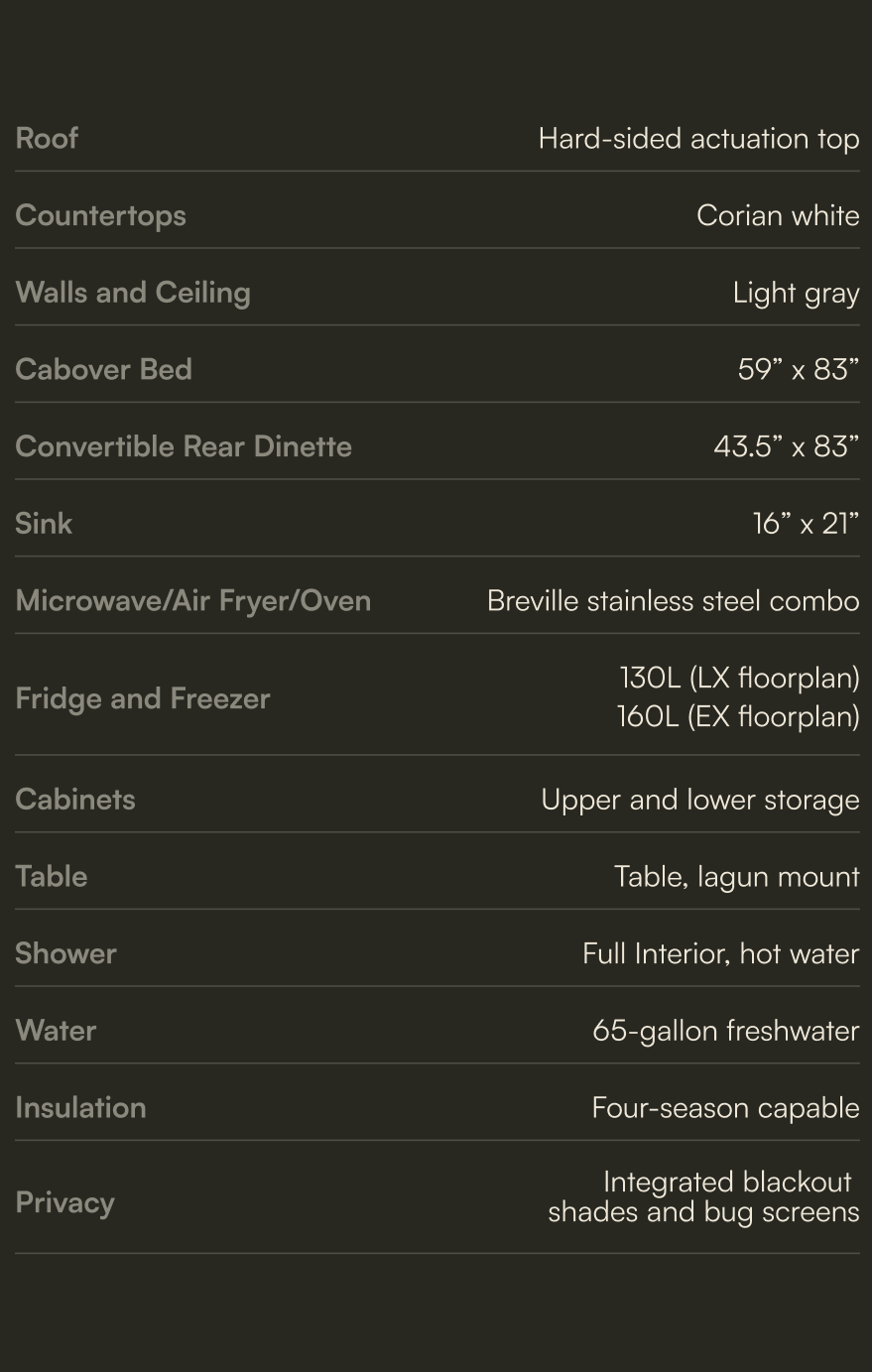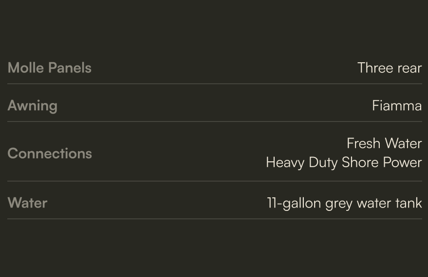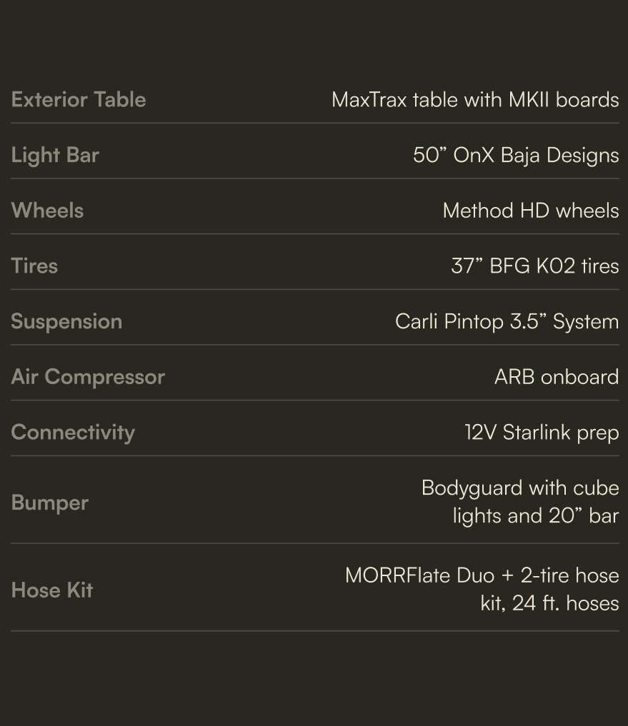 The Liquid Spring Suspension, paired with Method HD wheels and 5 x MPT81 335/80R20s, is the top-of-the-line choice for overlanders and adventure travelers who want reliability without compromise. Its adaptive, computer-controlled system constantly adjusts to terrain changes, offering a noticeably smoother ride, better handling, and improved ground clearance when you need it. Add in the strength and off-road traction of the Method/MPT81 combo, and you get a rig that stays stable under heavy loa