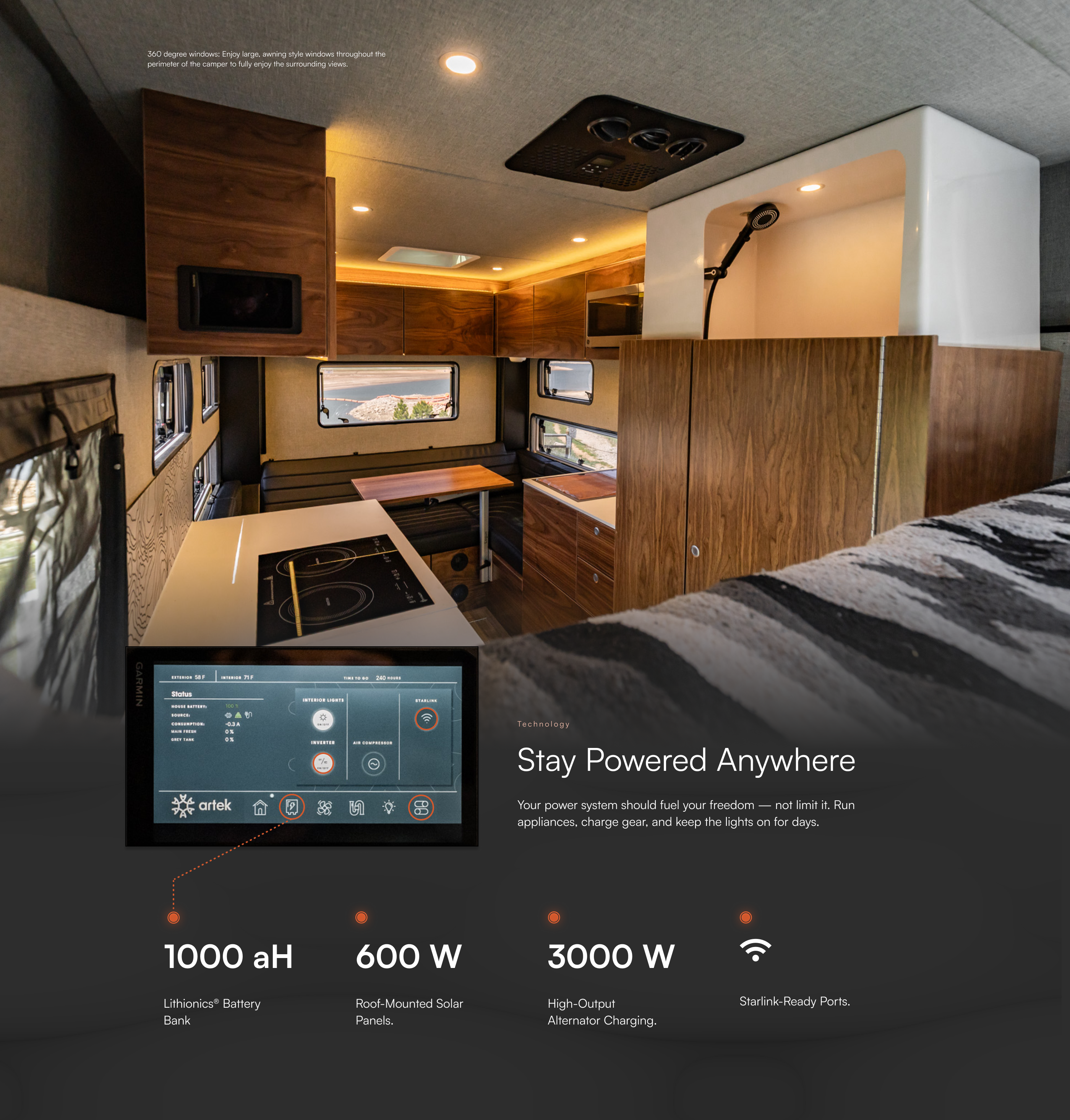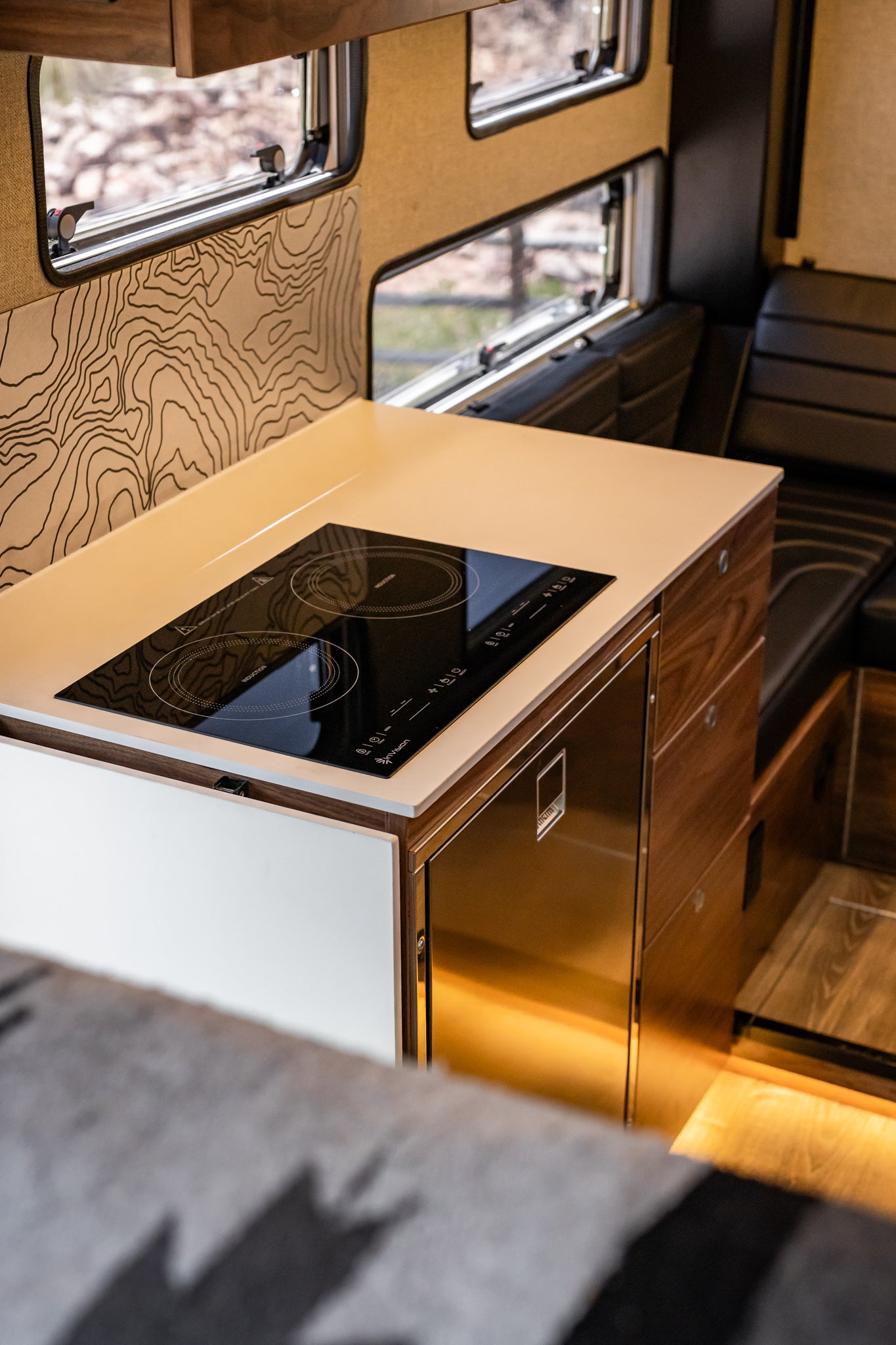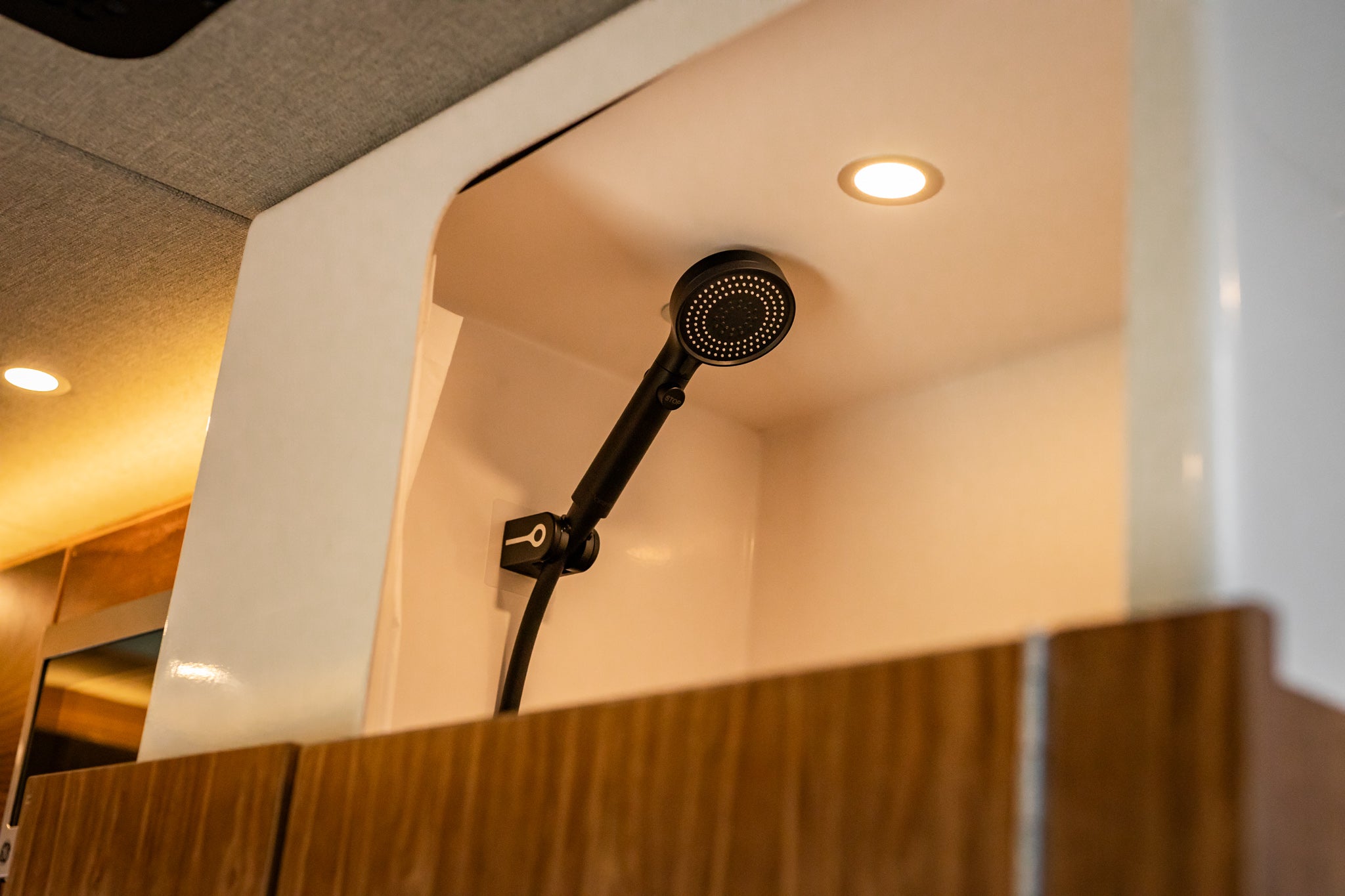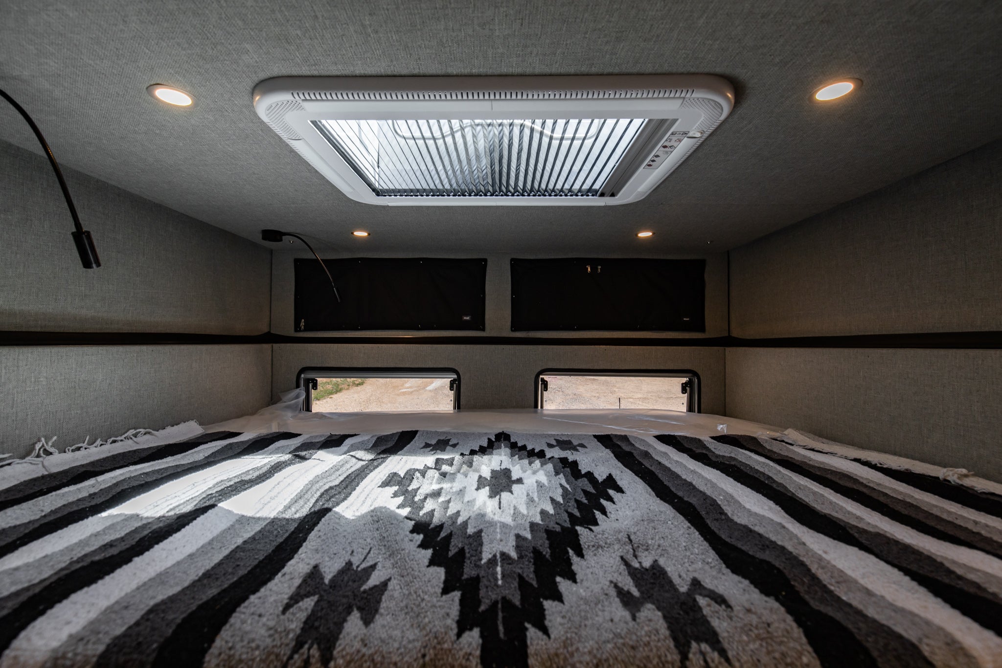 The skylight, vent above the bed, the 12V AC unit in the living space and Rixen heater altogether means you'll never not be comfortable in this rig.