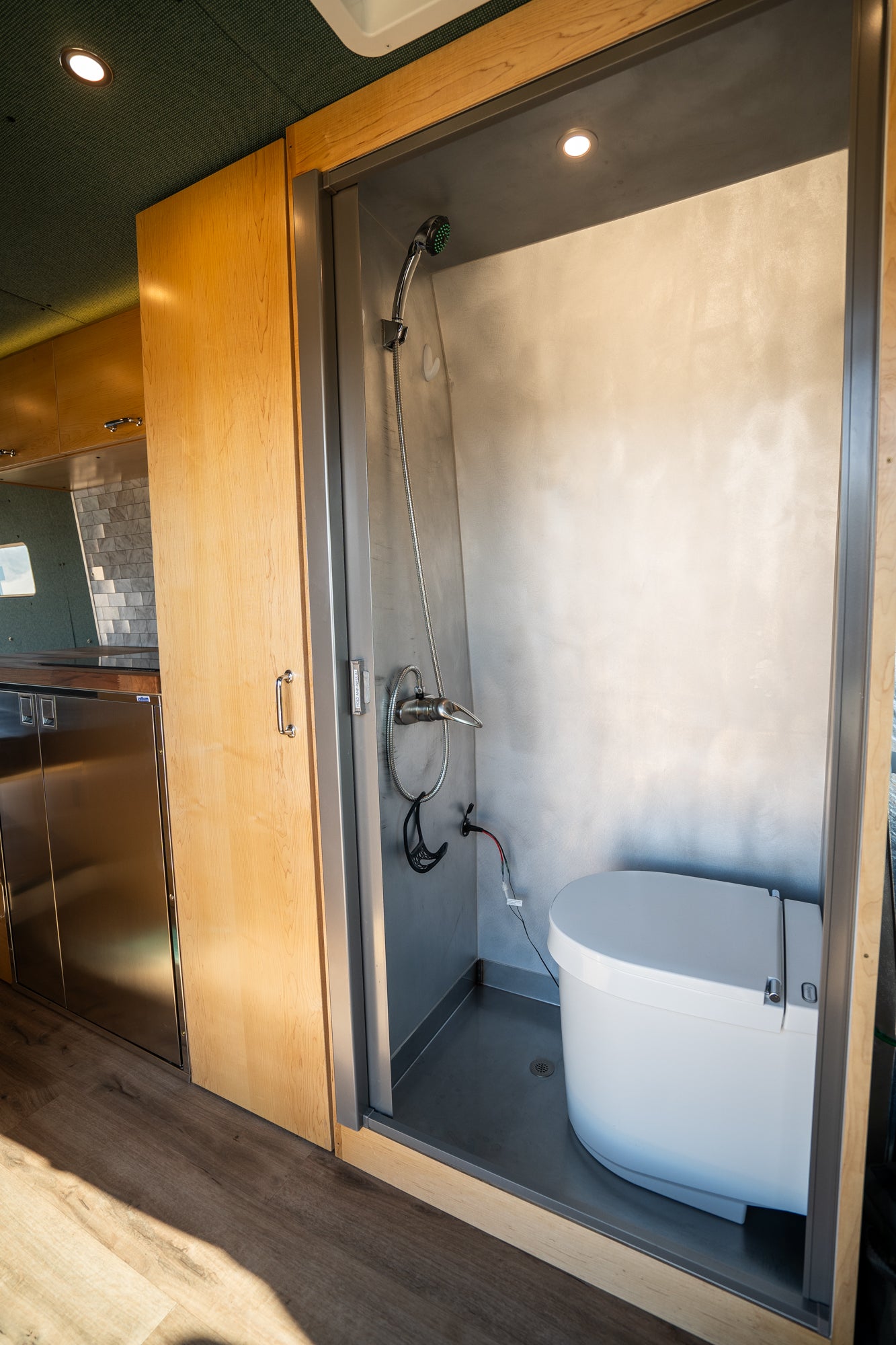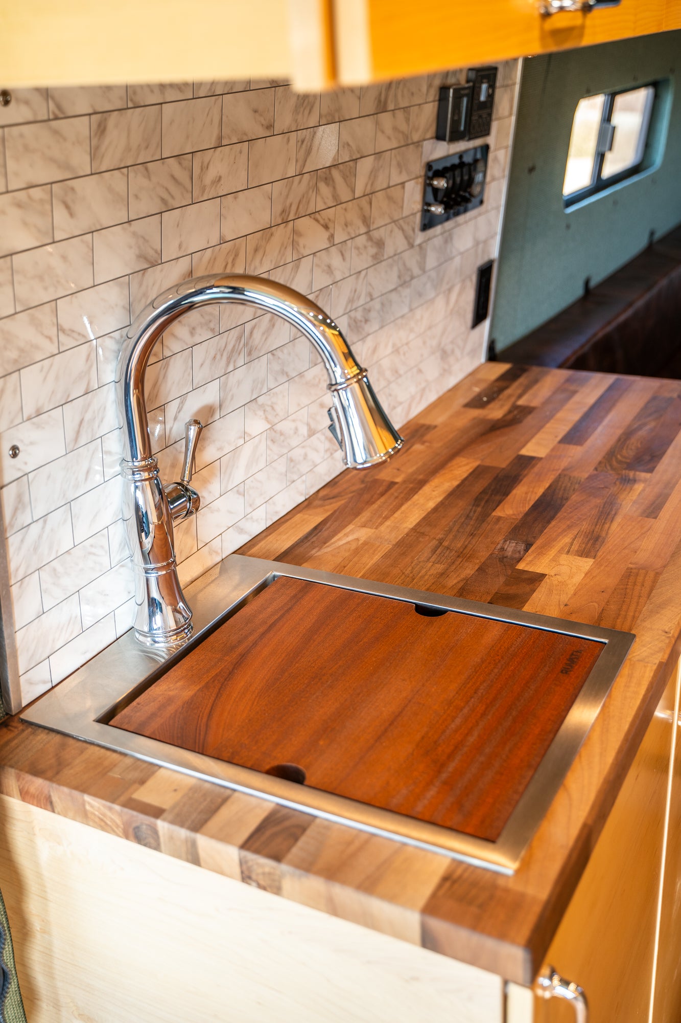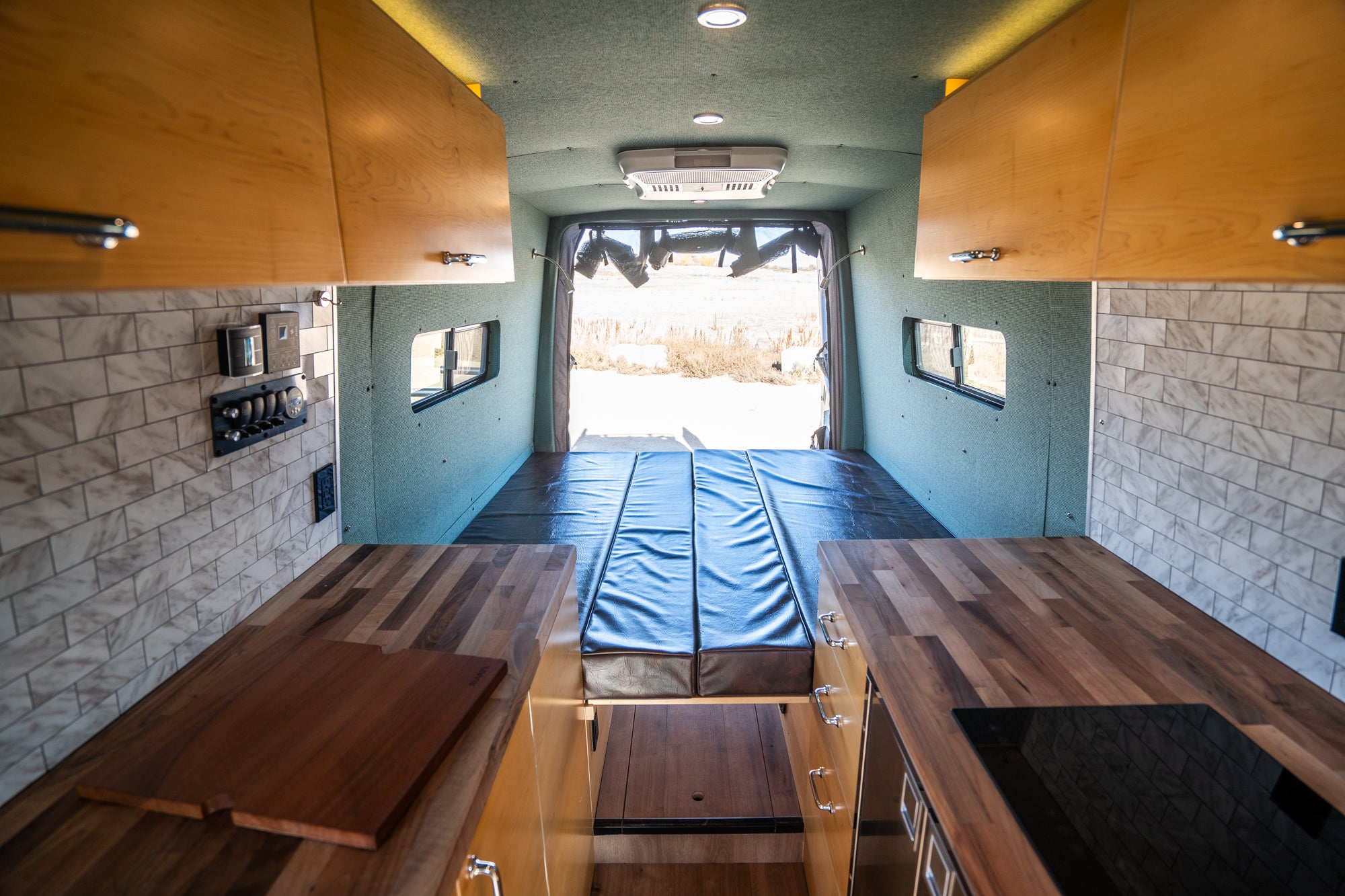 This build highlights an indoor shower with a composting toilet, a full kitchenette, and some great exterior upgrades to up the vehicle’s capabilities and hauling capacity.