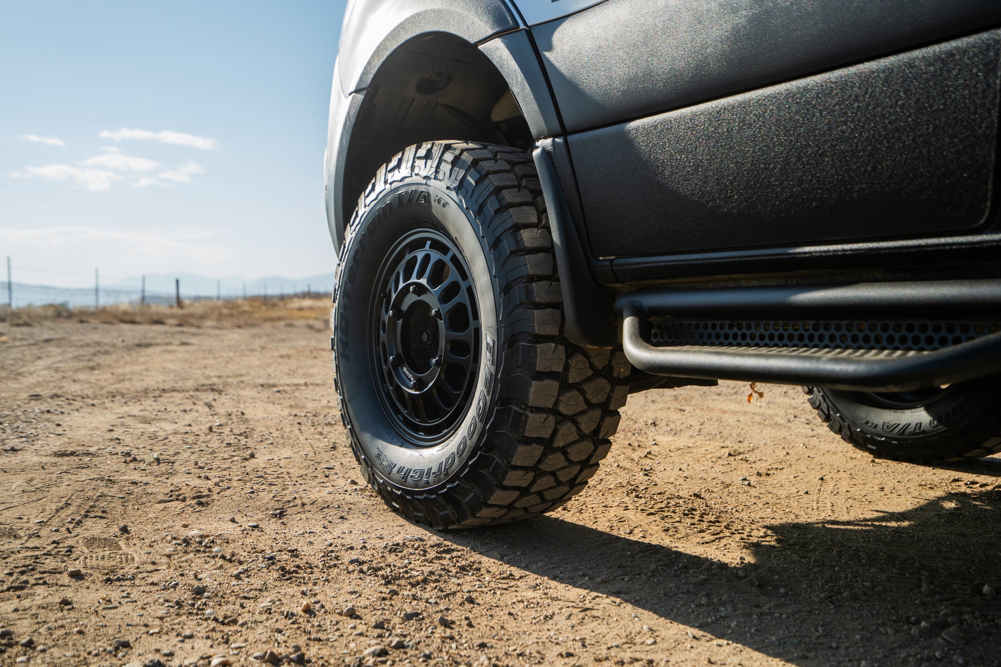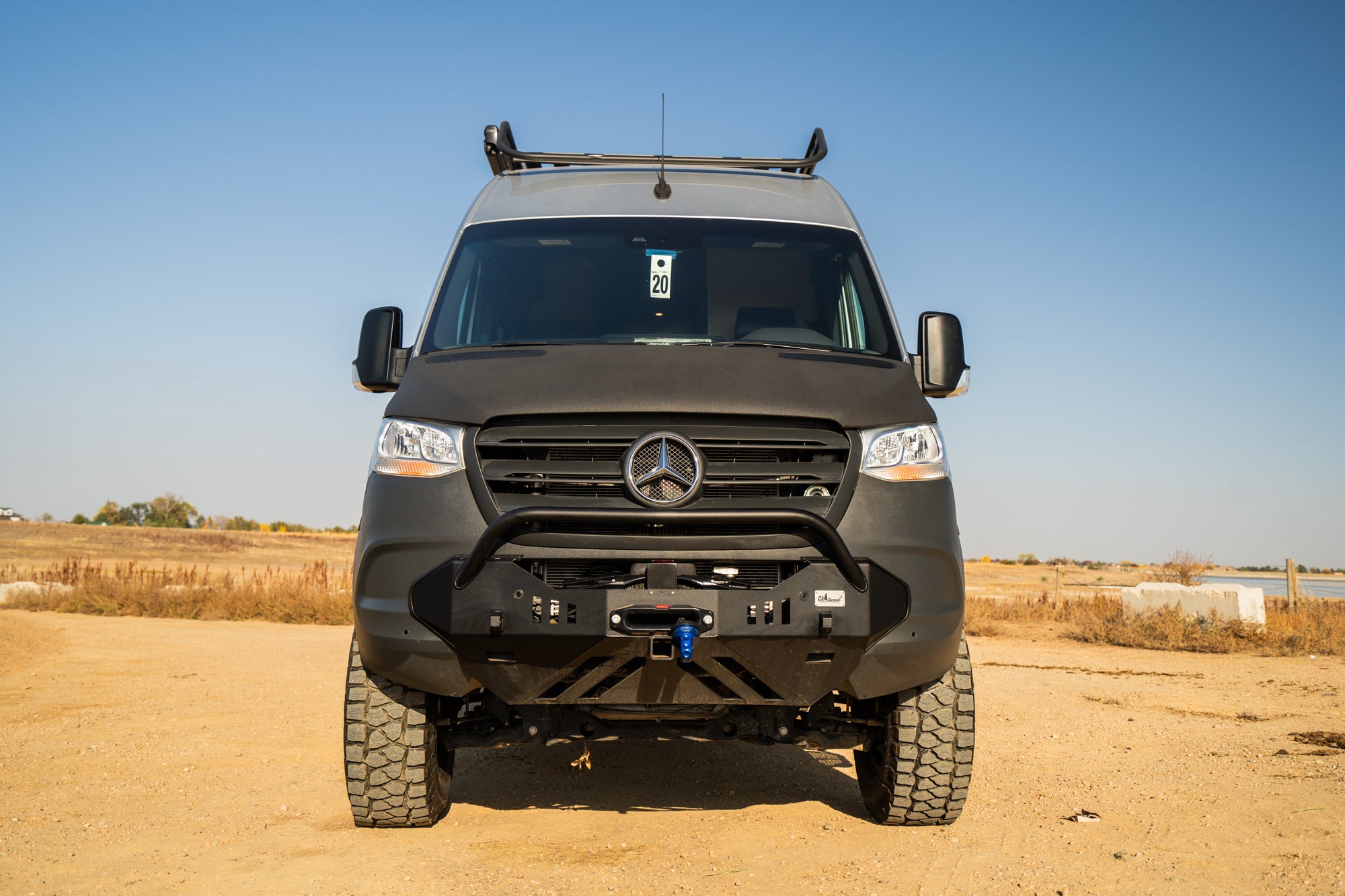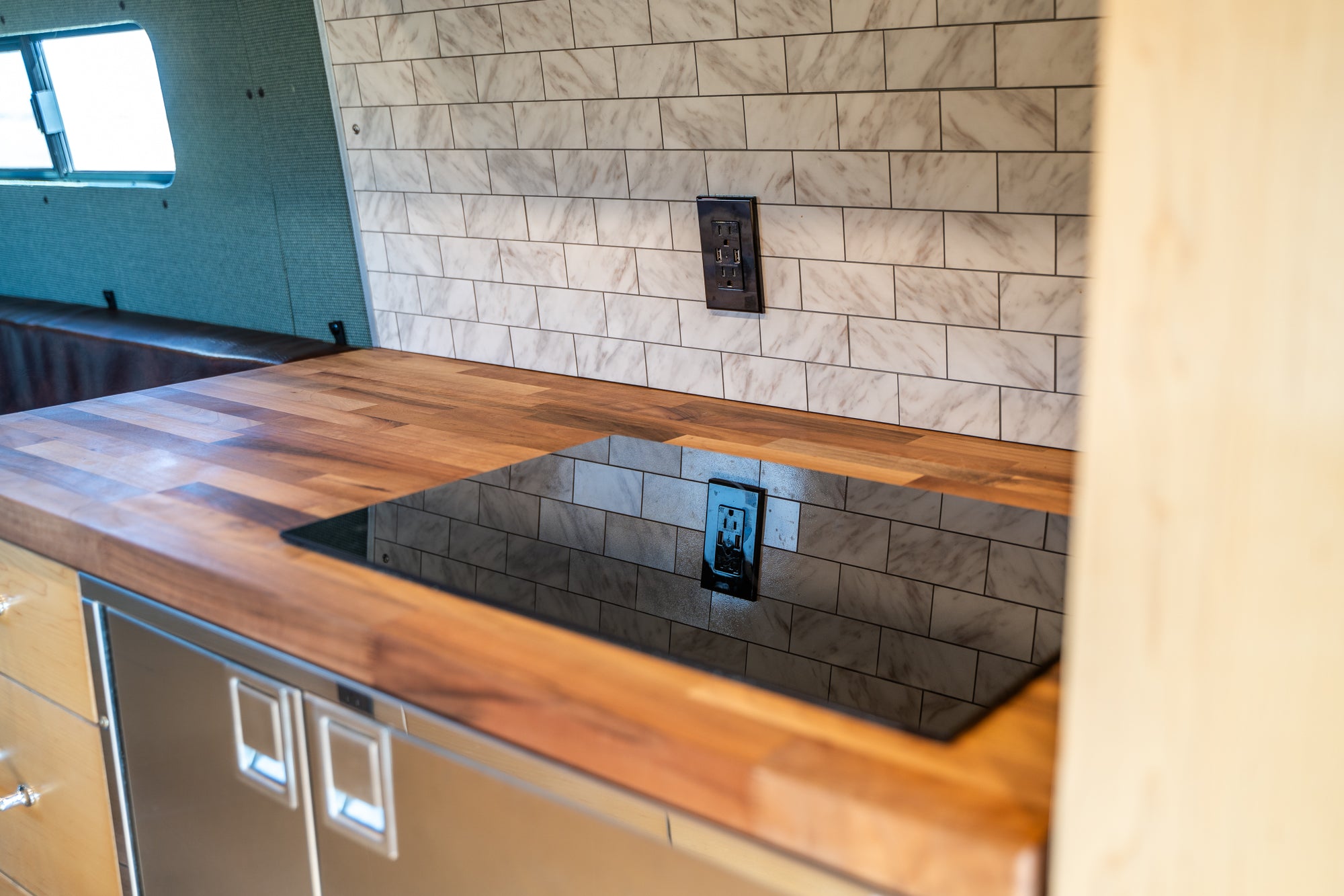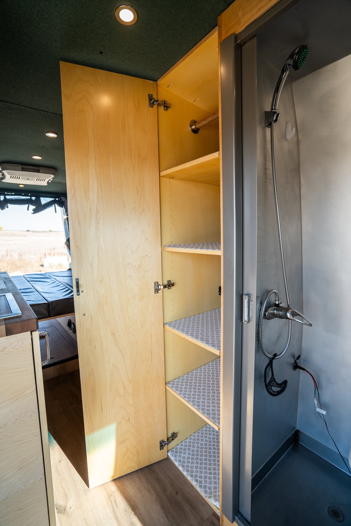 This build highlights an indoor shower with a composting toilet, a full kitchenette, and some great exterior upgrades to up the vehicle’s capabilities and hauling capacity.