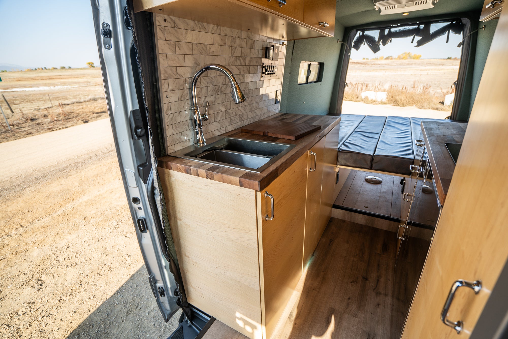 This custom adventure van comes with folding directors chairs, a snow shovel, and all of the kitchen gear you need so that you can hit the road and begin your next great adventure.