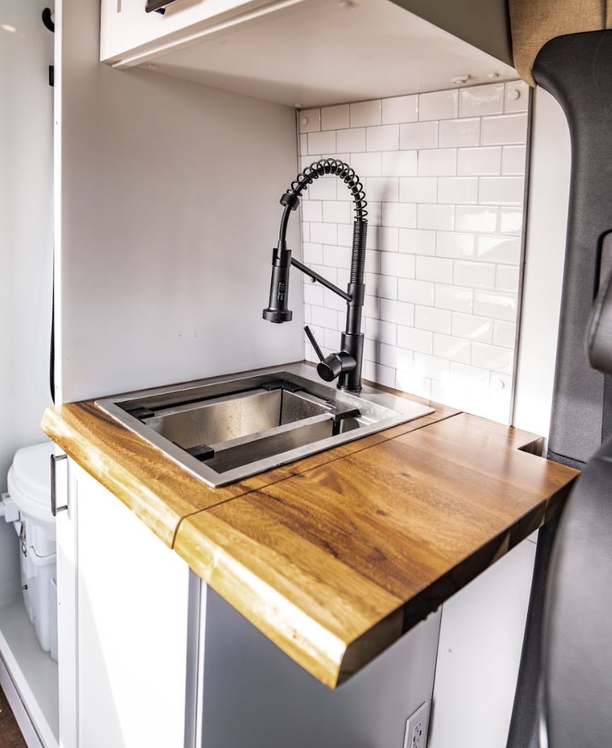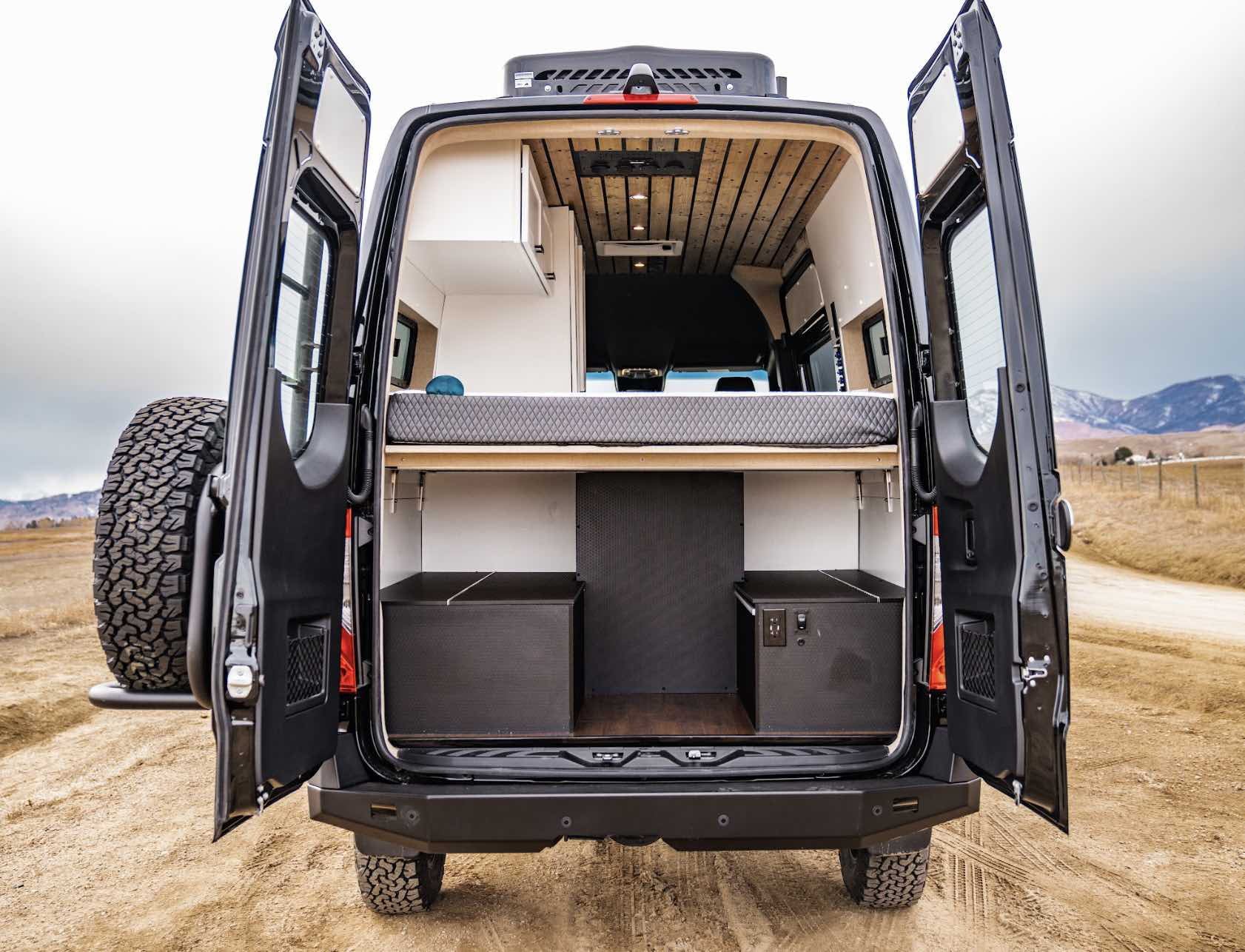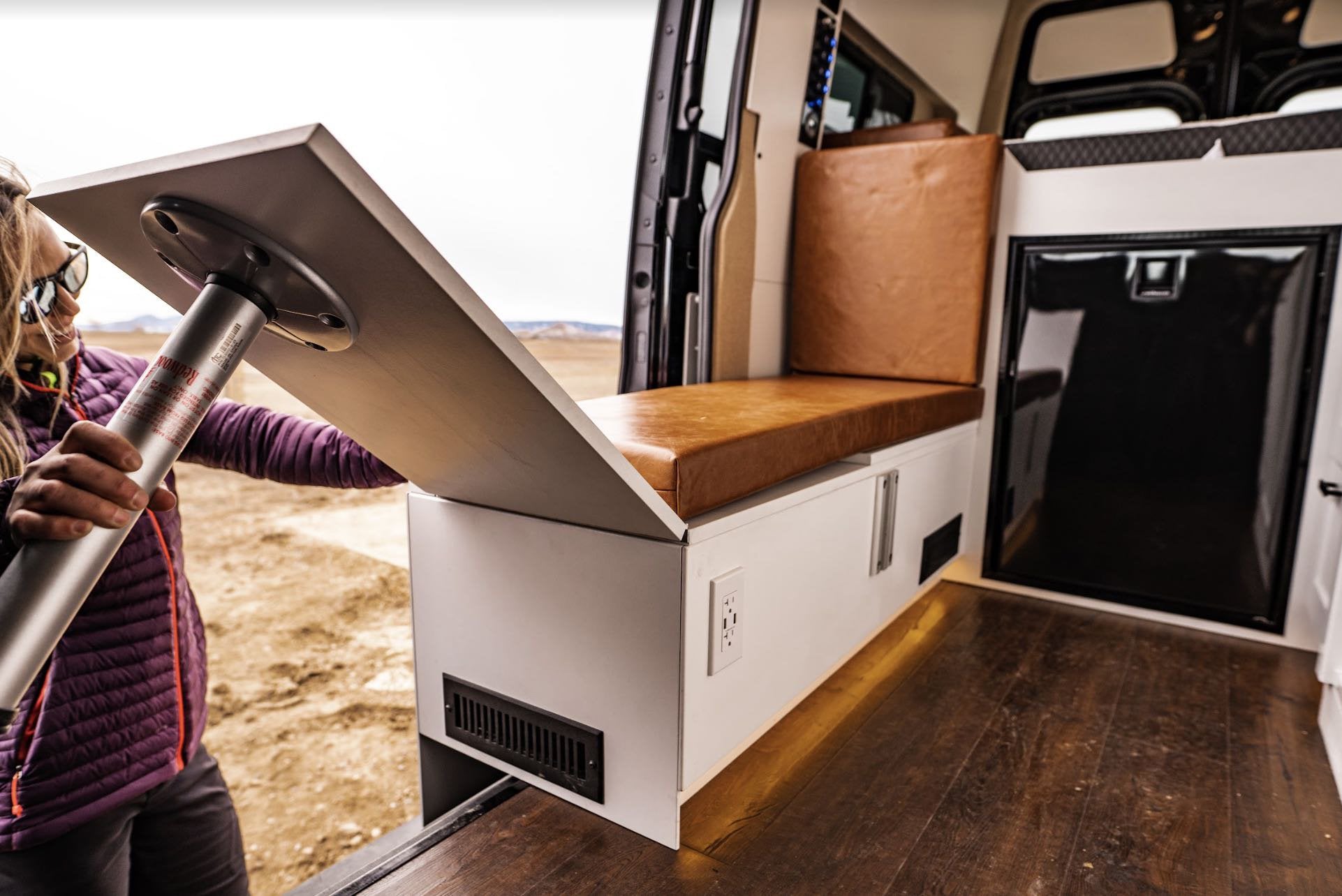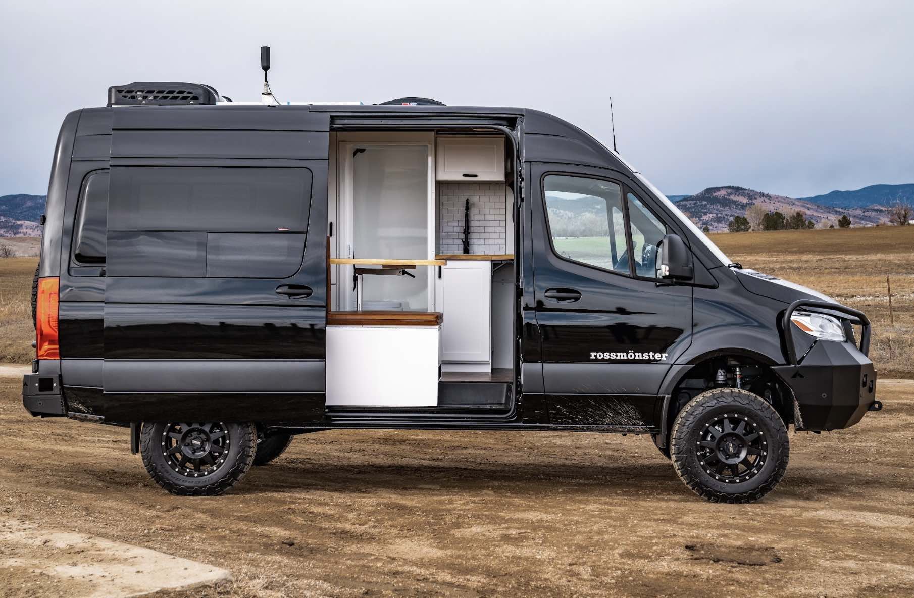 With a queen-sized fixed bed and a dinette that converts into an additional sleeping area for a guest, this Sprinter van conversion comes equipped. Method wheels and KO2 tires, 200-watt solar array, multiple lighting zones, an in-vehicle heater, live-edge Acacia countertops, and an indoor shower are all highlighted within this offroad adventure van.
