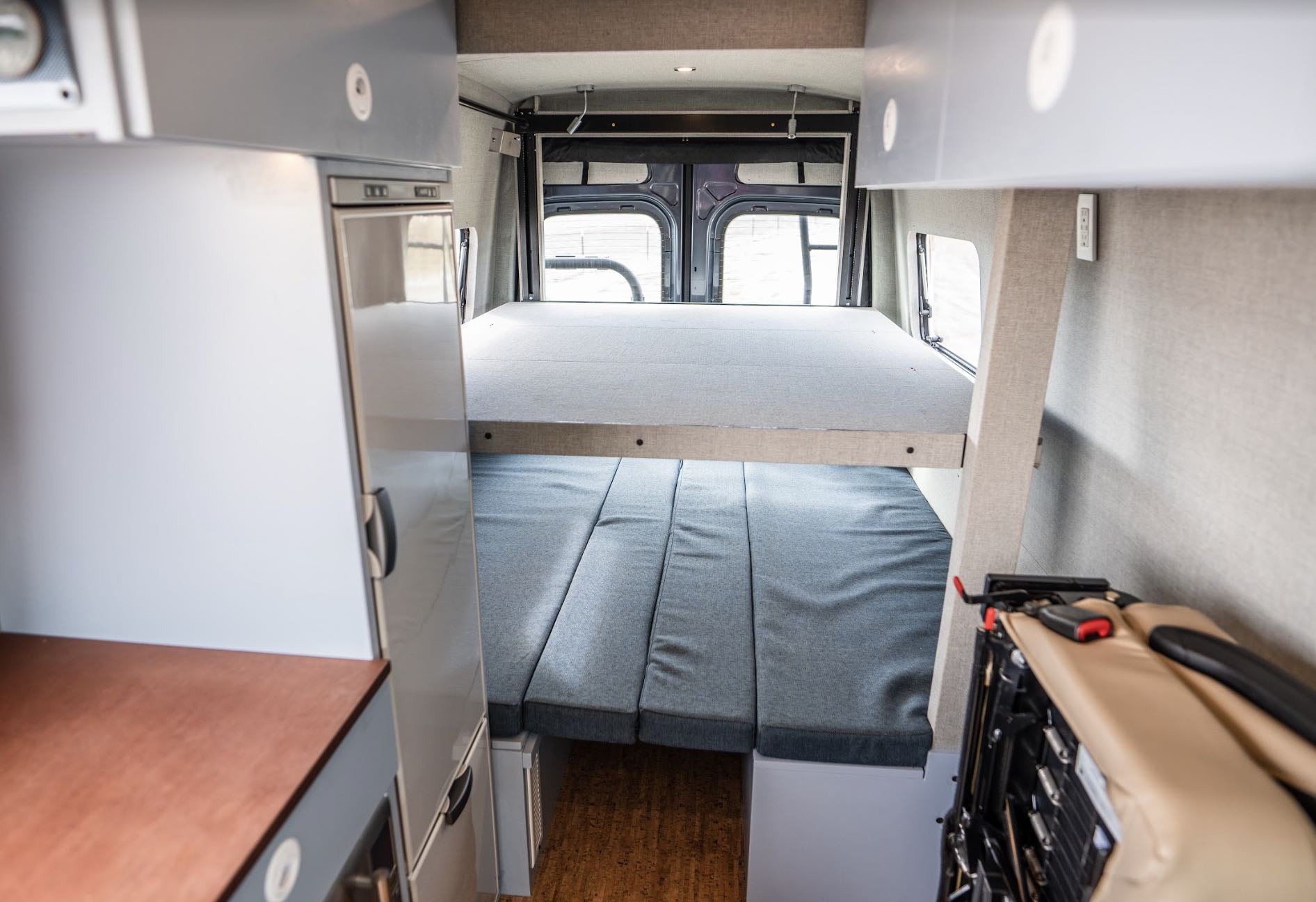 Room to sleep four: Queen-sized bed on HappiJac bed lift system and rear dinette that converts into a secondary sleeping area