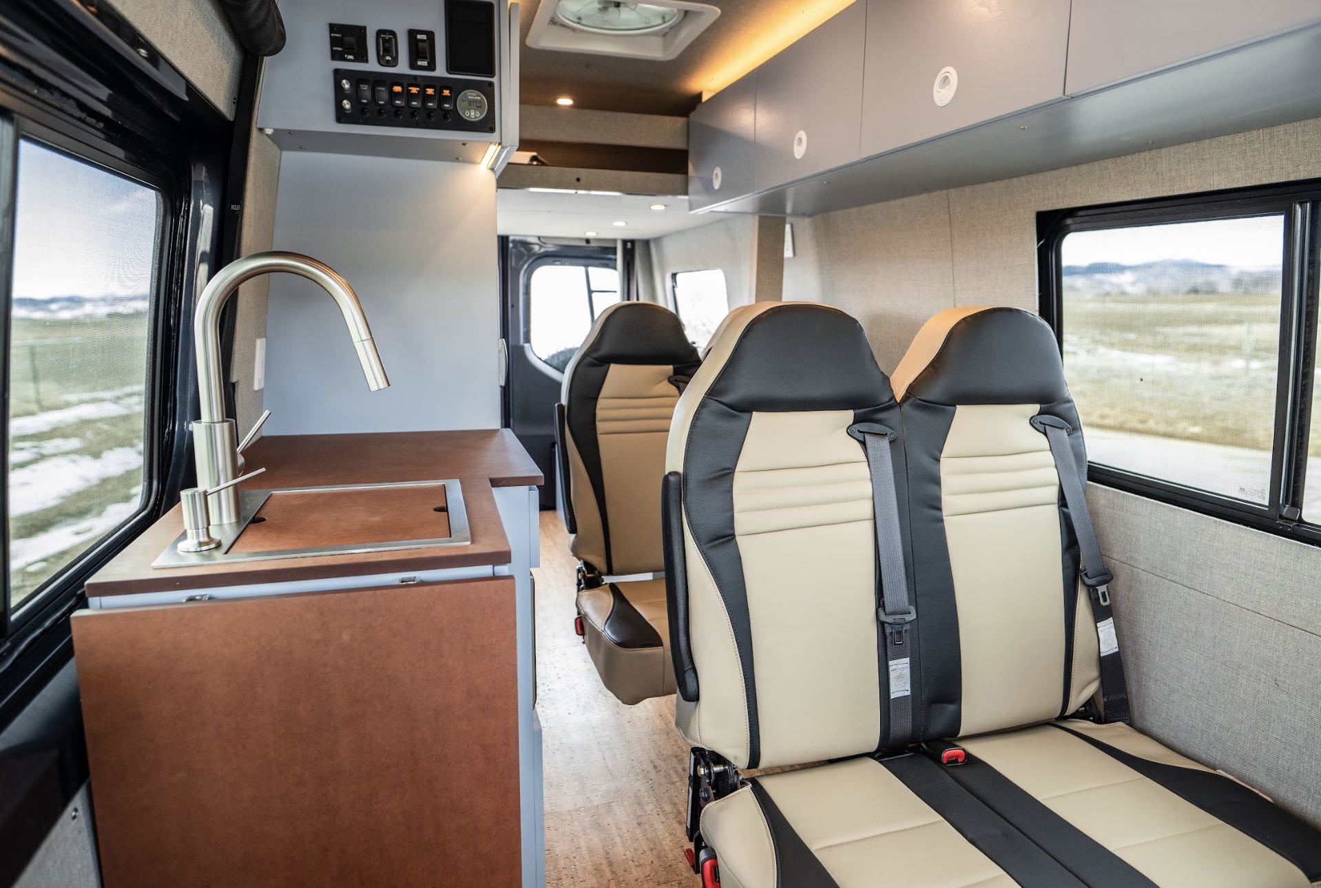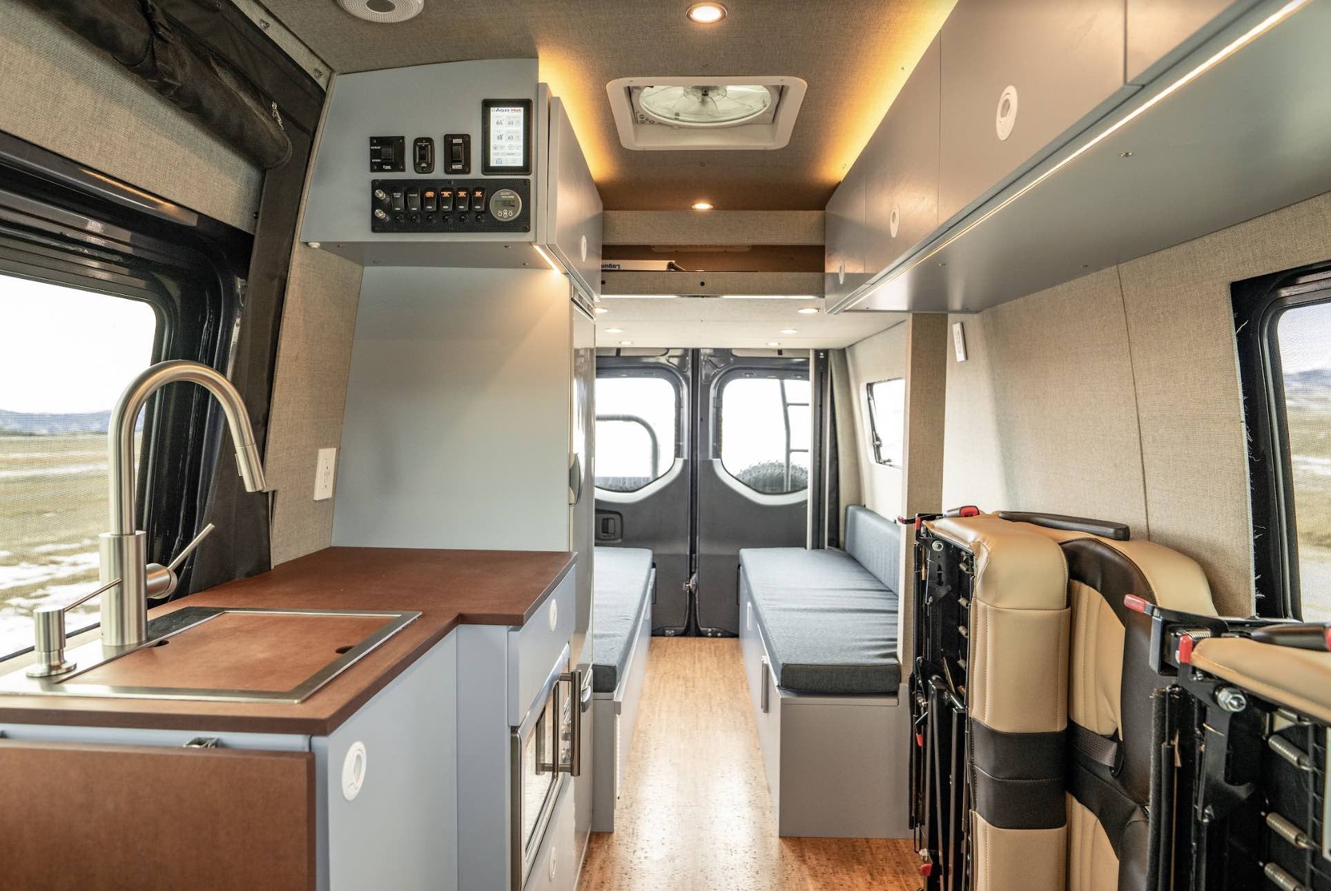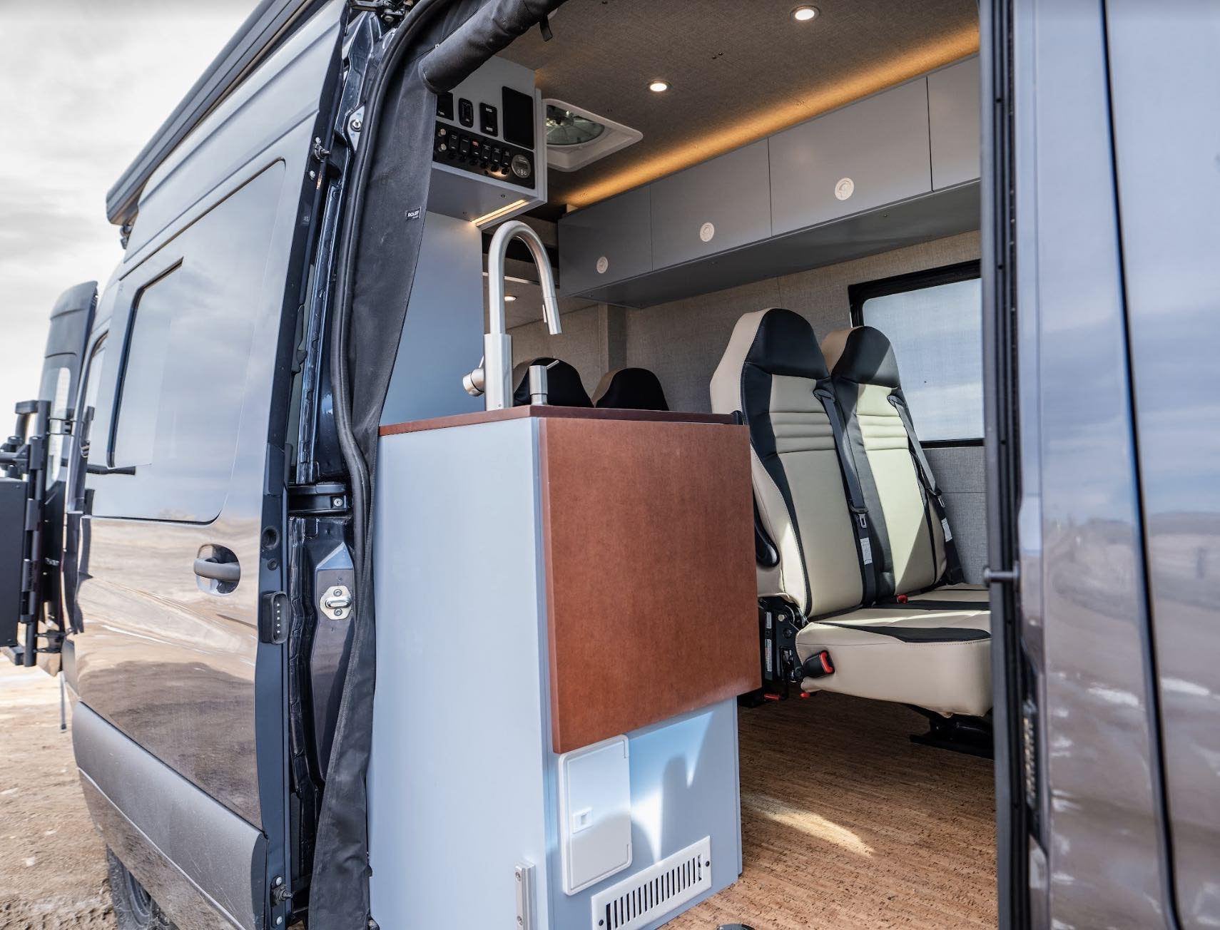 Plumbing: Wrappon portable toilet, 30-gallon fresh water tank, inline water filtration system, and an outdoor shower at the sliding door