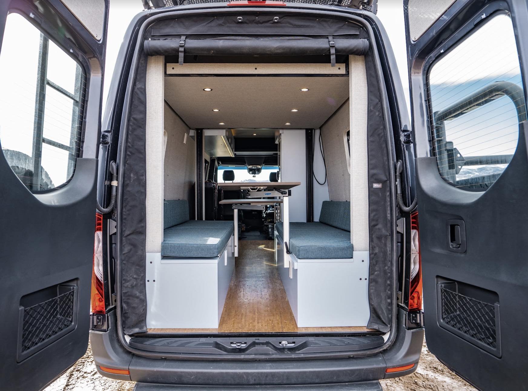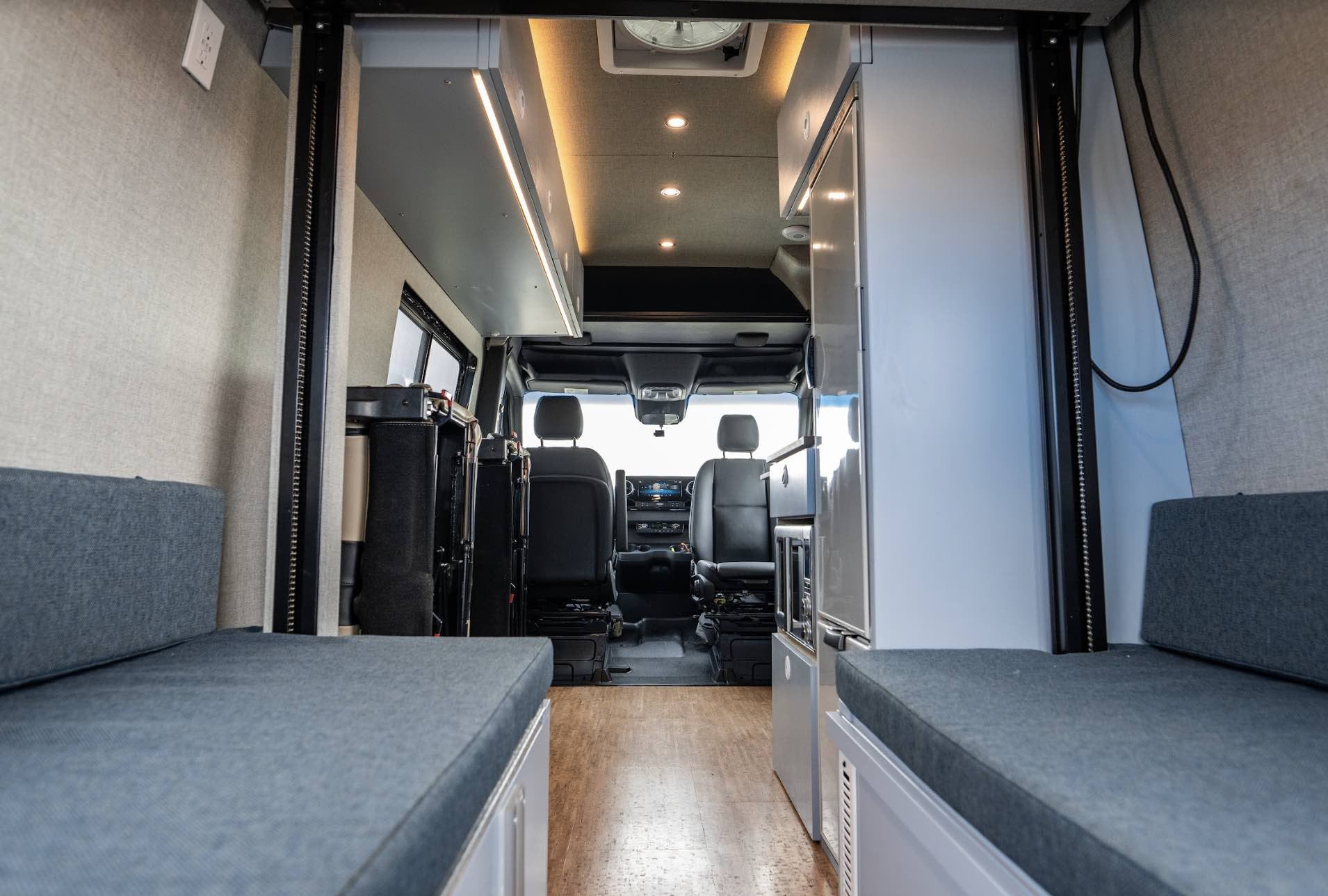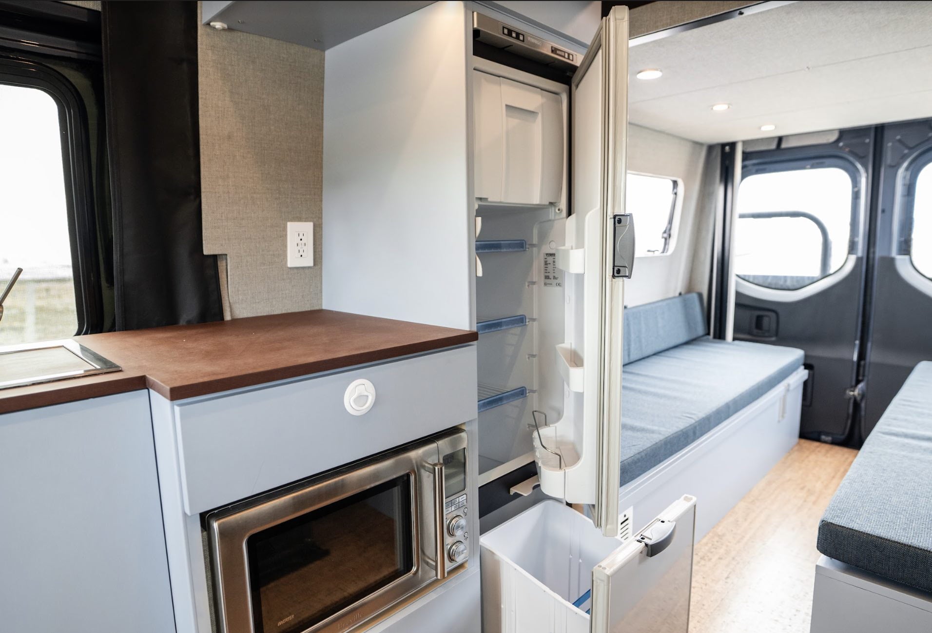 Plumbing: Wrappon portable toilet, 30-gallon fresh water tank, inline water filtration system, and an outdoor shower at the sliding door